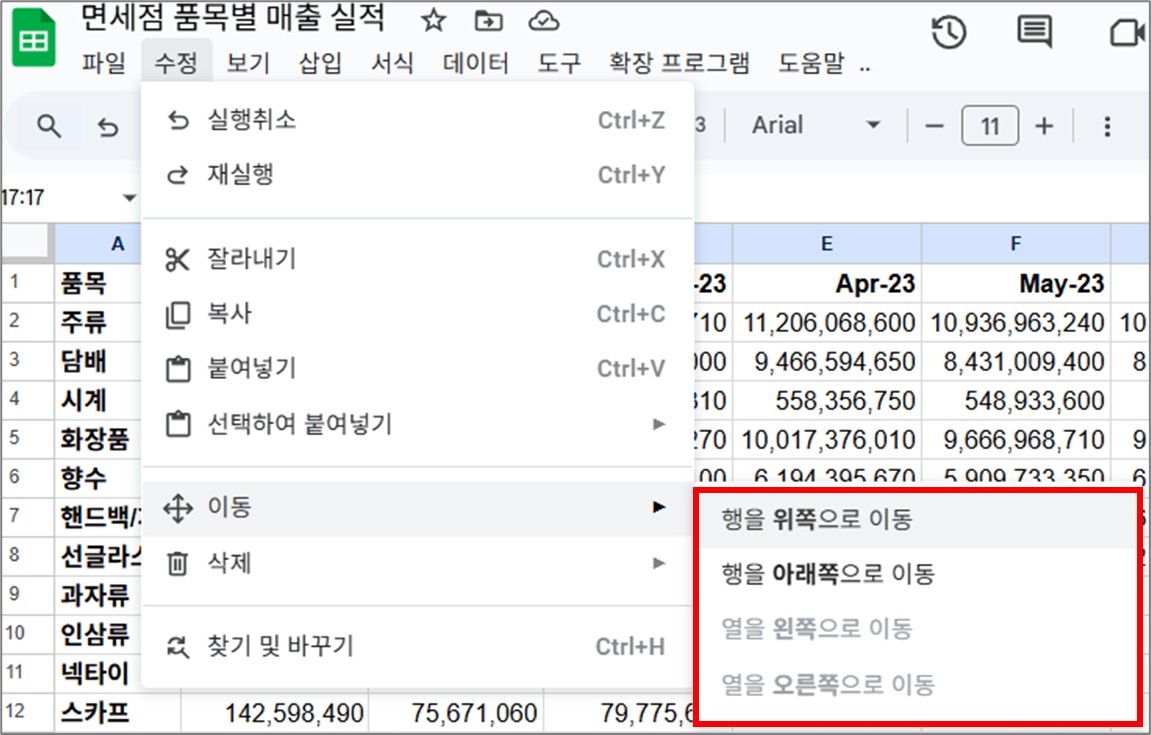 - 행또는 열 선택 → 상단 수정 메뉴 → 이동에서 원하는 이동 선택