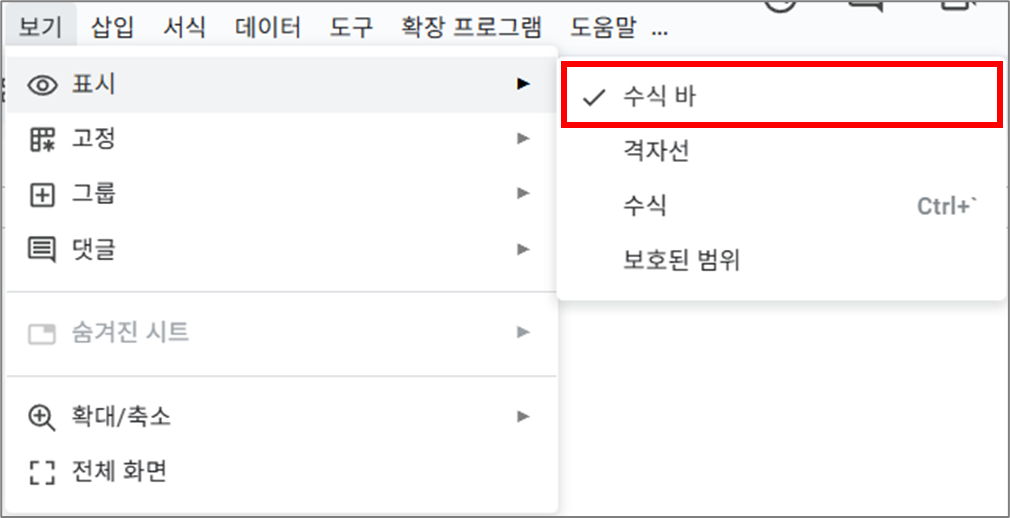 - 상단 메뉴 보기 > 표시 > 수식바를 체크하면 나타나고, 체크 해제 시 숨겨집니다.