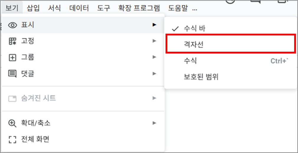 | 격자선 | 셀 경계선을 화면에 표시 여부를 선택 | 보기 > 표시 > 격자선 |
