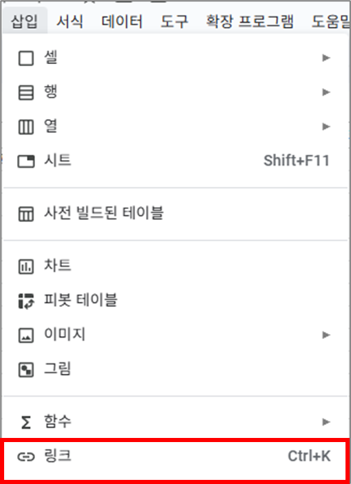 - 상단 메뉴에서 삽입 → 링크 클릭.