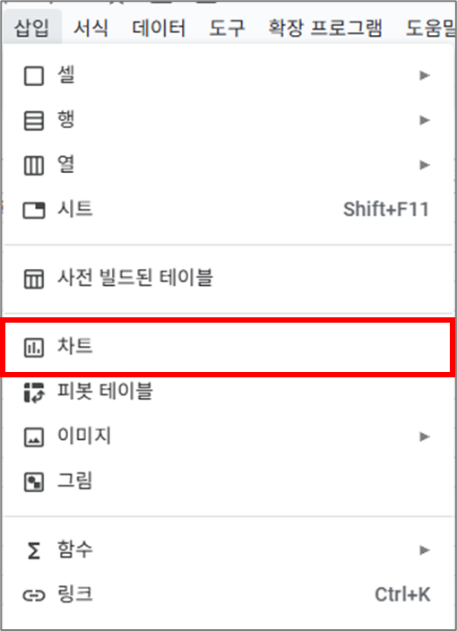 - 상단 메뉴에서 삽입 → 차트를 클릭합니다.