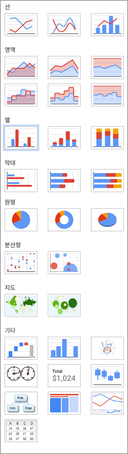 - 데이터를 시각적으로 표현할 수 있는 도구로, 막대형·꺾은선형·원형·콤보 등 다양한 그래프 형태를 제공합니다.