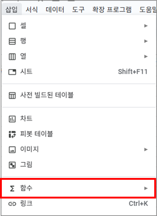 - 상단 메뉴에서 삽입 → 함수 선택 후 원하는 함수 카테고리(예: 수학, 논리, 텍스트 등)를 클릭합니다.