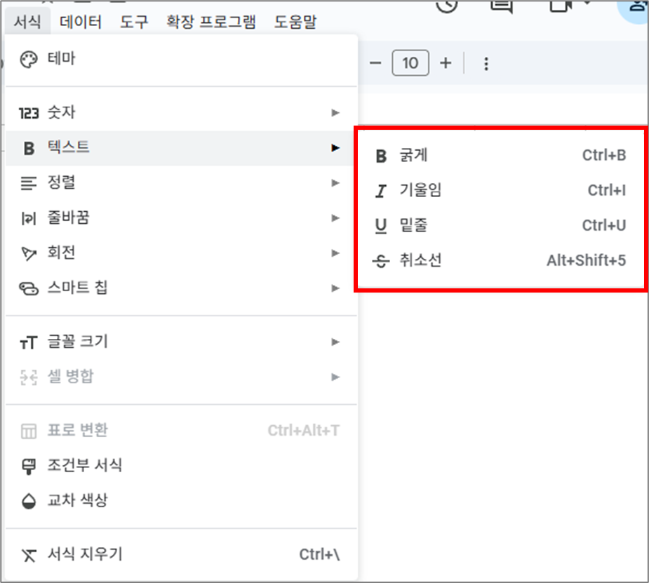 - 상단 메뉴 서식 → 텍스트 → 굵게/기울임/밑줄/취소선 등 선택