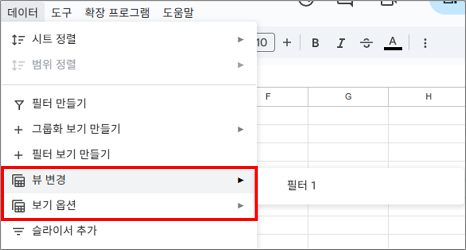 - 상단 메뉴에서 데이터 → 필터 보기 → 새 필터 보기 만들기