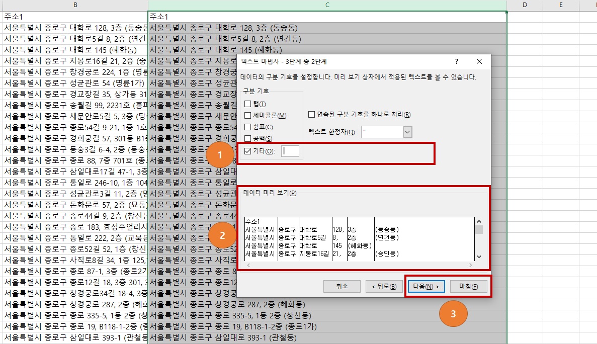 2. 3번의 구분 기호로 분리됨 체크 후 다음 클릭
