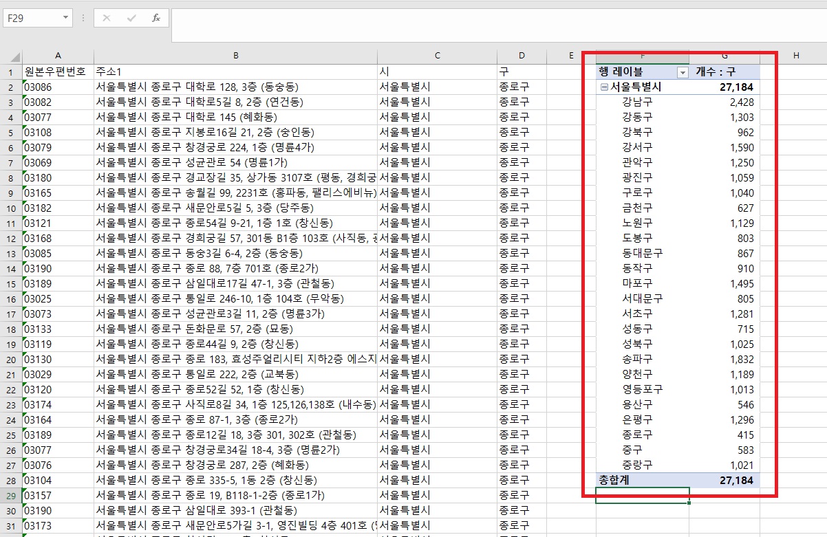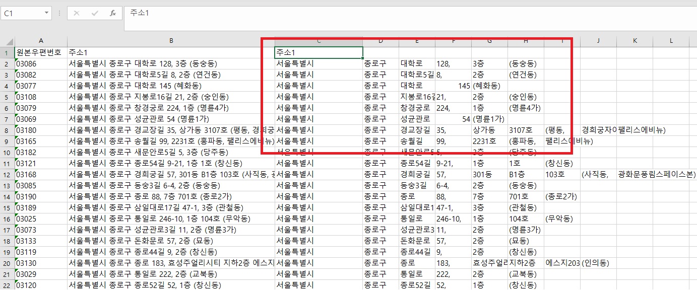 아래에 있는 주소를 엑셀 텍스트 나누기를 해보겠습니다.