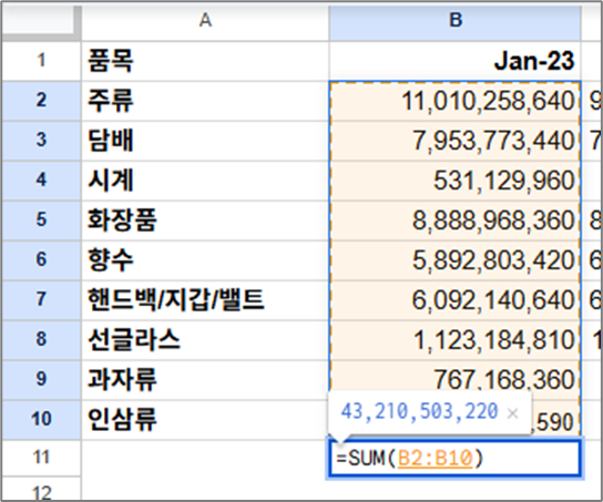 이렇게 쓰면 B2부터 B10까지의 숫자를 모두 더한 값이 자동으로 계산됩니다.