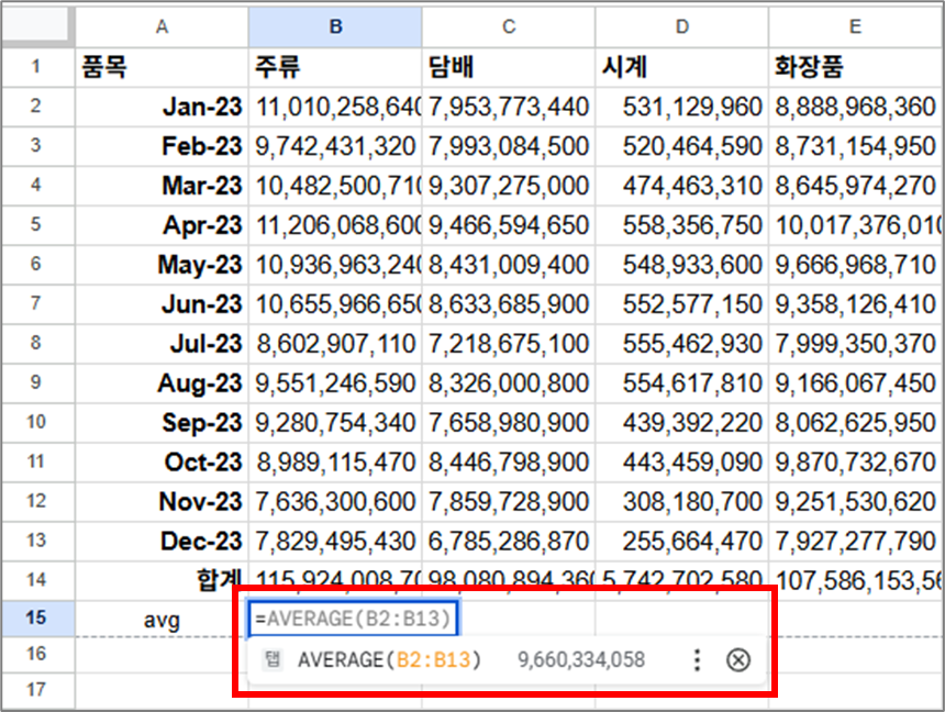 이렇게 입력하면 B2~B13의 평균을 자동으로 계산해 줍니다.