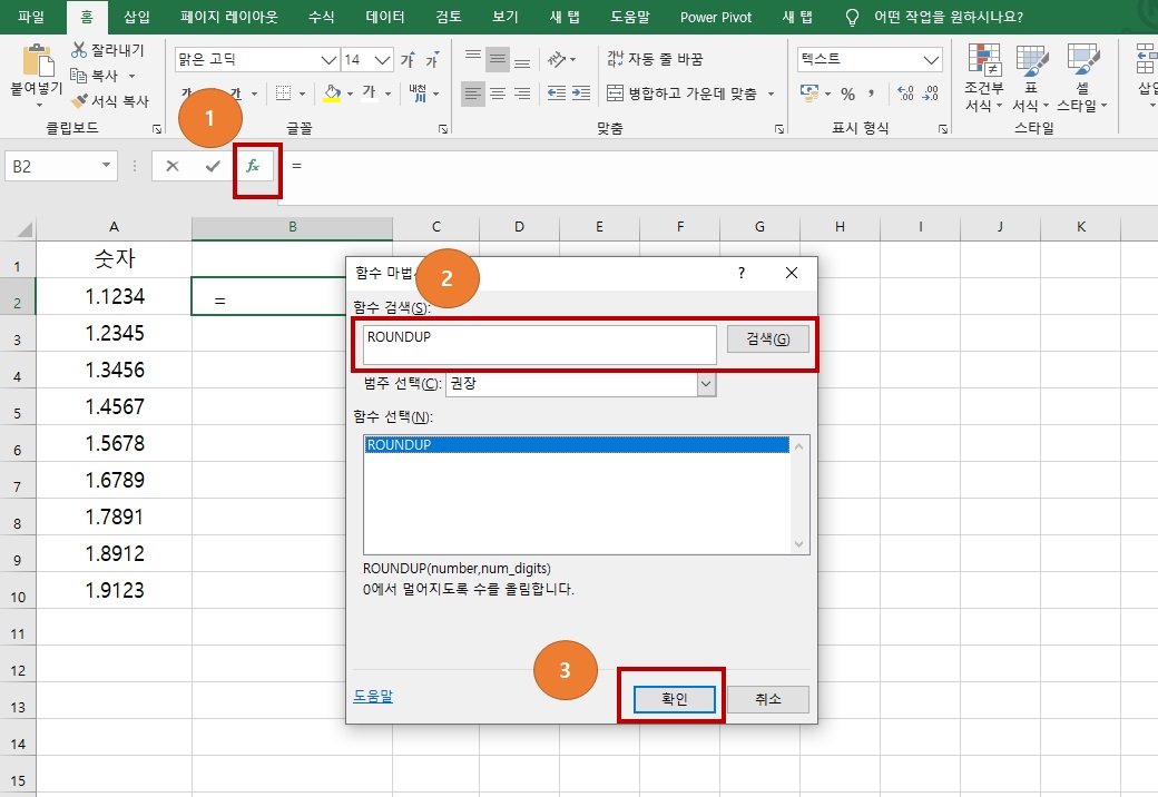 2번에 함수 검색에 ROUNDUP을 적고 검색을 눌러주세요, 범주 선택을 통해서 찾기도 가능합니다.
