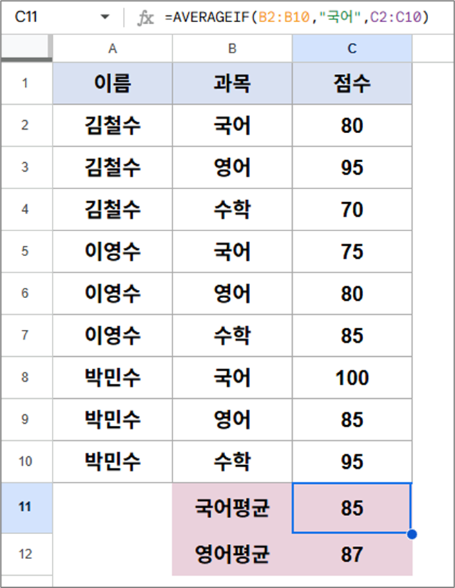 =AVERAGEIF(B2:B10,"국어",C2:C10)