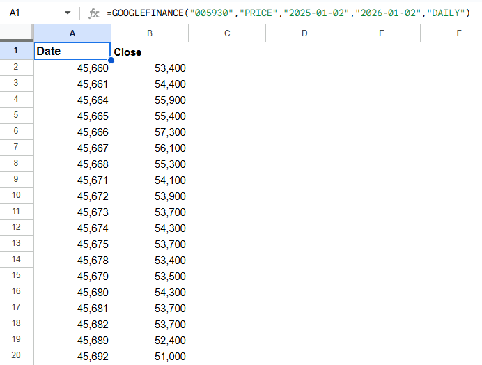 =GOOGLEFINANCE("005930","PRICE","2025-01-02","2026-01-02","DAILY")