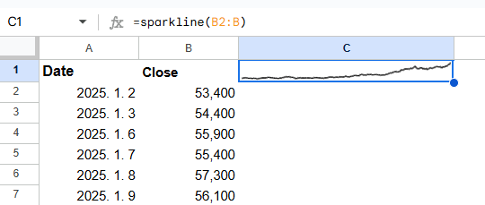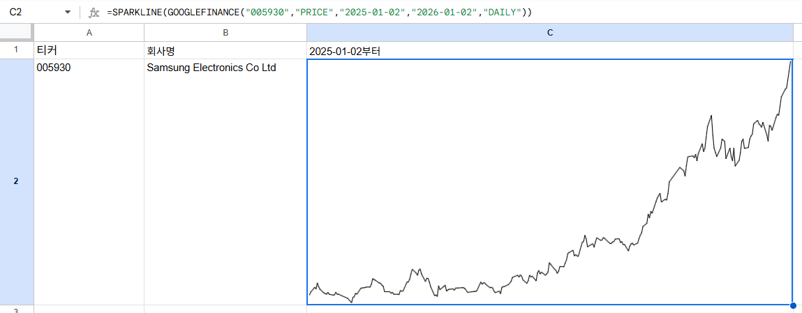 =SPARKLINE(GOOGLEFINANCE("005930","PRICE","2025-01-02","2026-01-02","DAILY"))