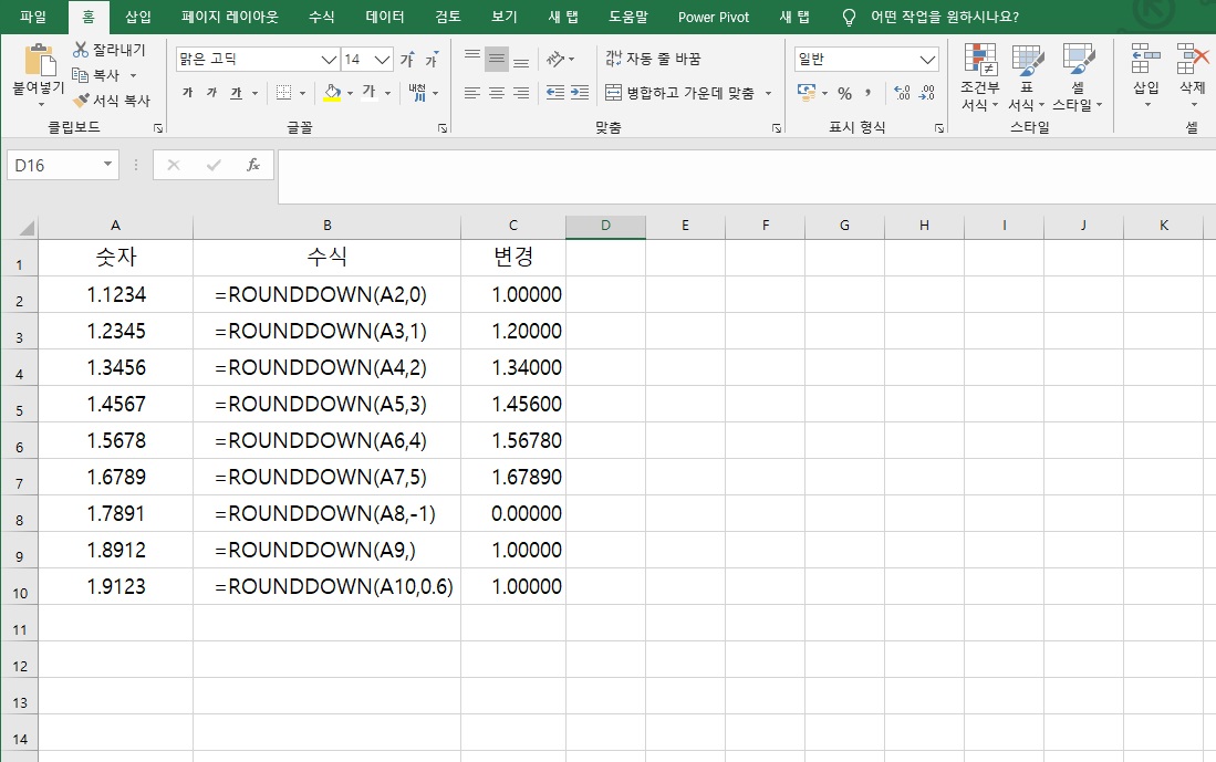 B열 수식을 보면 소수점 0번째 내림, 1번째 내림, 2번째 내림..... C열에 변경된 값이 나옵니다.