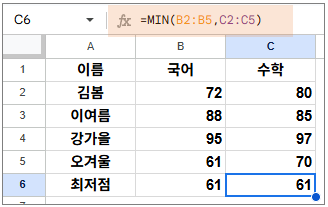 구글 스프레드시트 MIN 함수 사용법