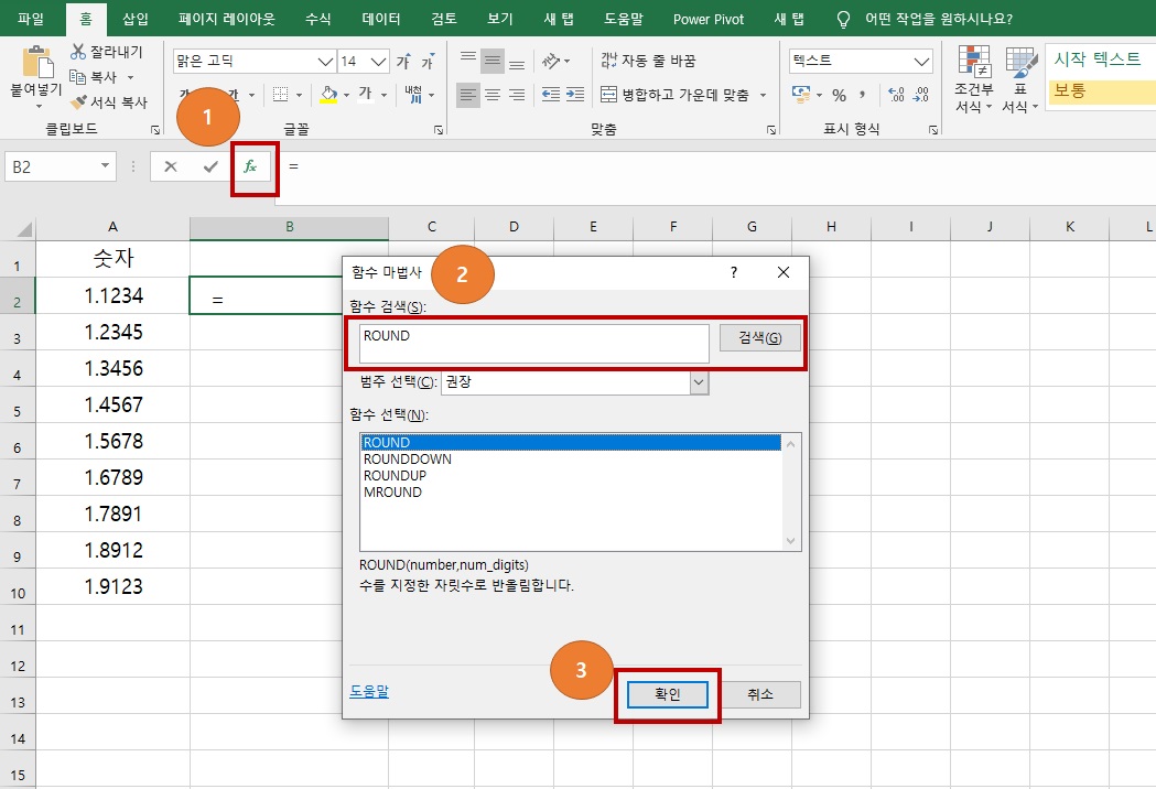 2번에 함수 검색에 ROUND를 적고 검색을 눌러주세요, 범주 선택을 통해서 찾기도 가능합니다.