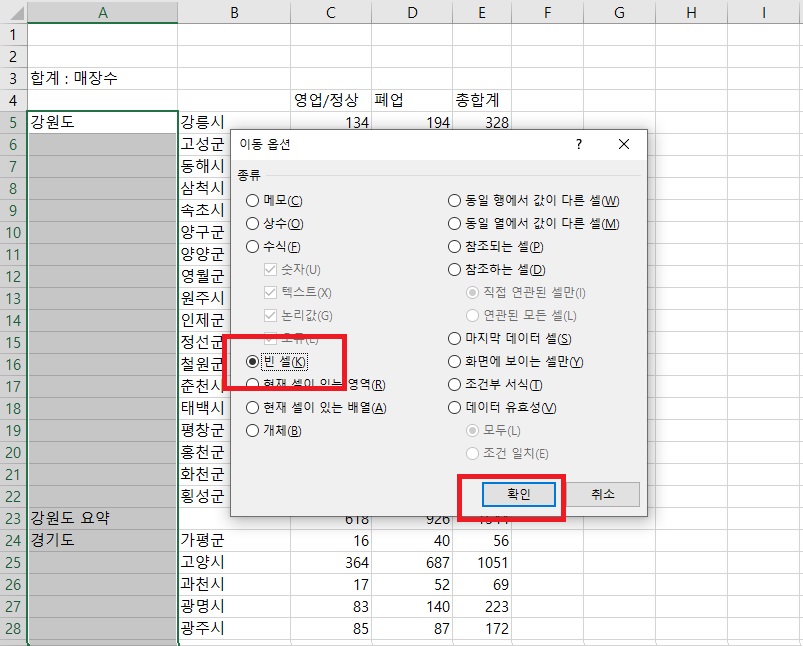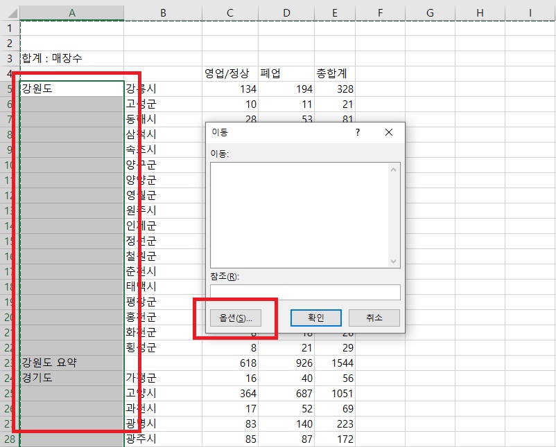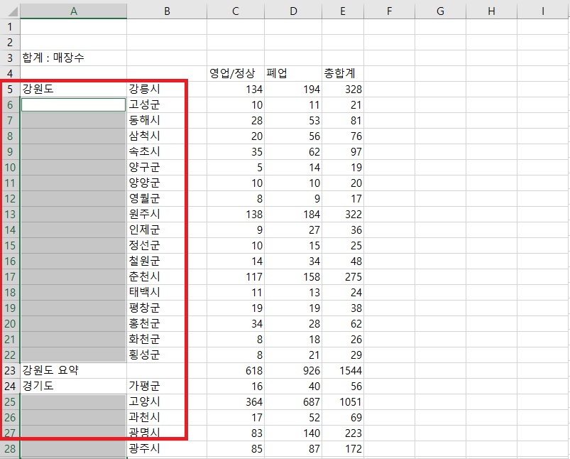 2. 비 어이 있는 열에 채워 넣을 셀부터 해서 드래그를 해서 셀을 잡아주세요. (강원도부터 클릭)