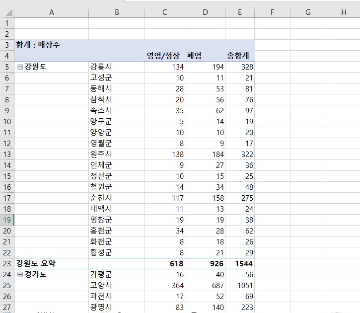 아래처럼 강원도, 경기도 밑에는 비어 있습니다.