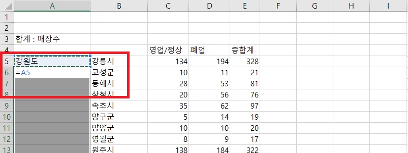 빈셀에 = 기호 입력 후 방향키 ↑ 클릭해서 A5(강원도) 선택 후 Ctrl + Enter (컨트롤과 엔터를 동시 클릭)
