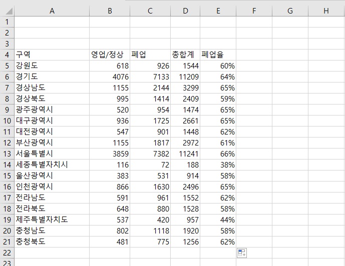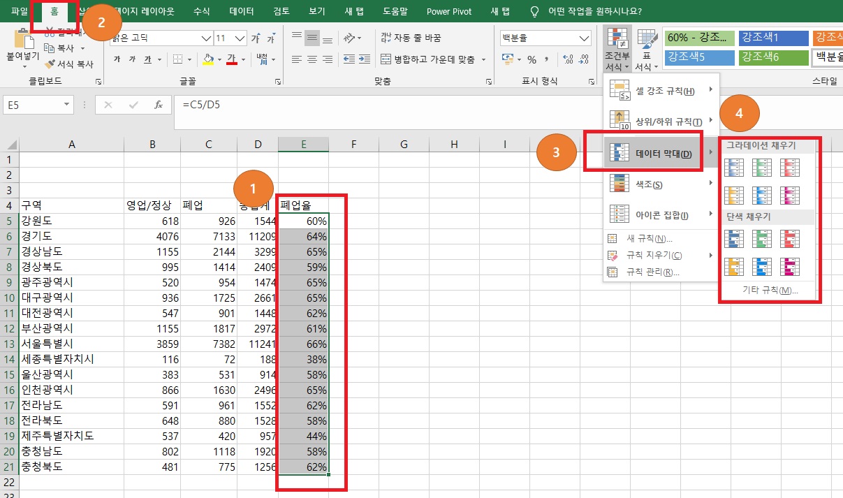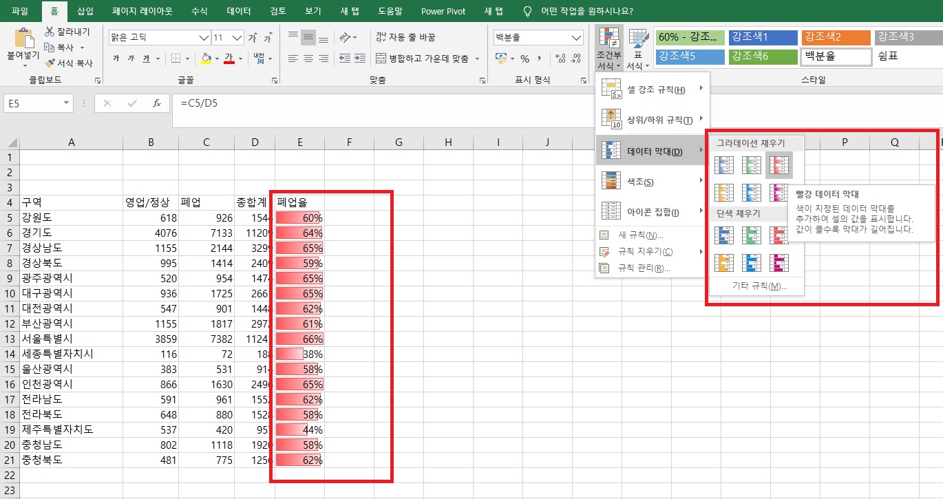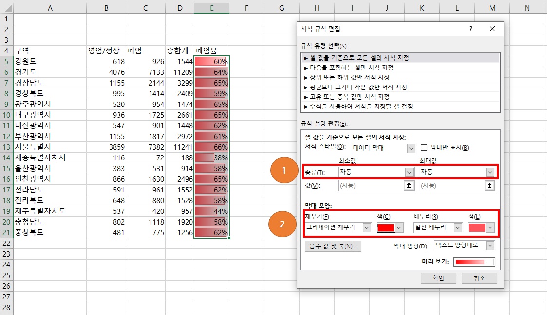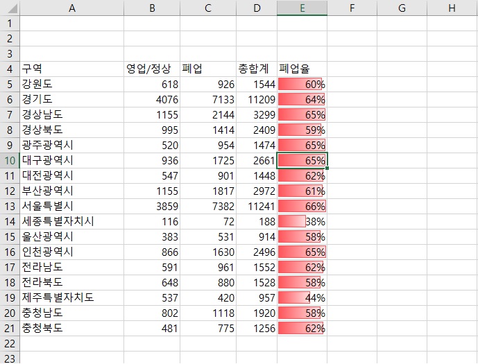 데이터 색이며 폐업율에 따라 셀 칸 안에서 그래프 형태로 색이 칠해집니다.