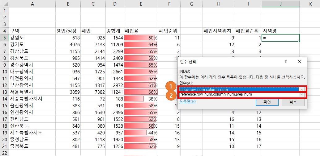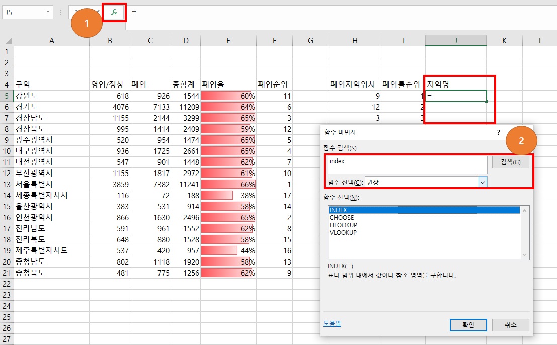 1) H5 = 9 (F열 폐업 순위에서 9번째가 폐업률 1위라는 뜻임) / MATCH 함수로 9번째인 것을 구함