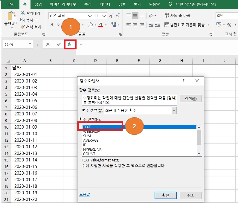 2. 함수 마법사를 사용해서 TEXT함수를 시작해보세요.