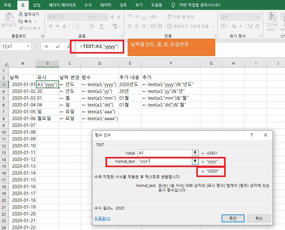 엑셀 날짜 년도,월,요일 변경하기_TEXT 함수사용하기