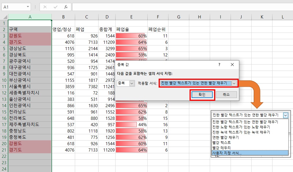 중복일 경우 "진한 빨강 텍스트가 있는 연한 빨강 채우기" 후 확인 진행