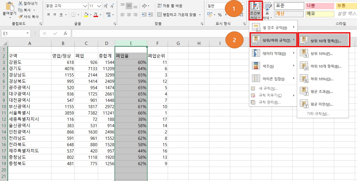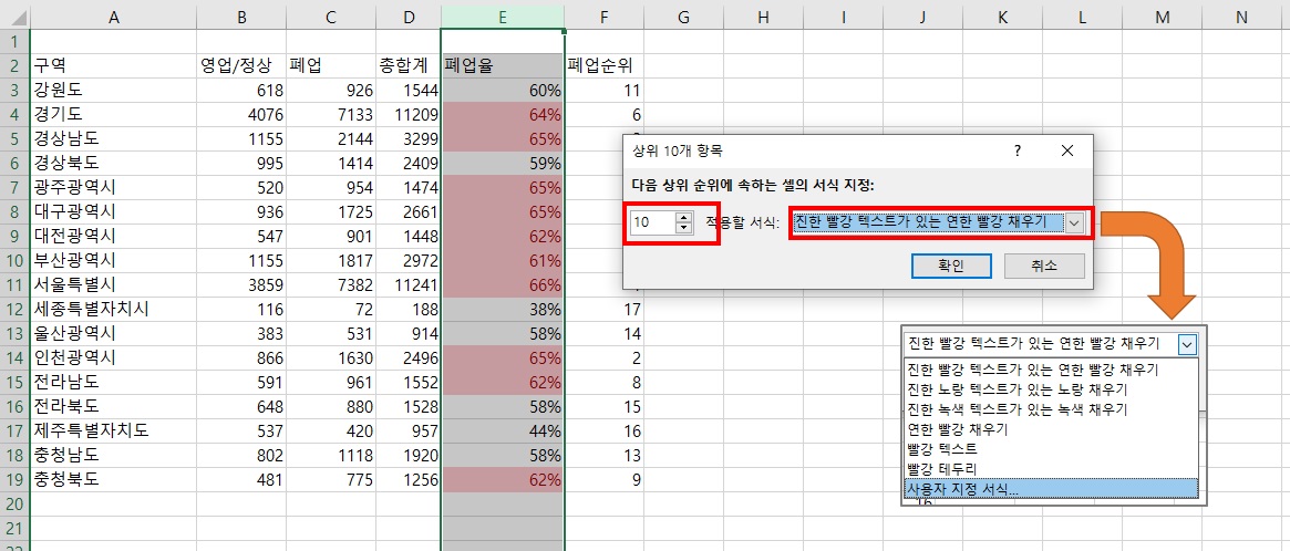 엑셀 조건부 서식 상위 10개 설정