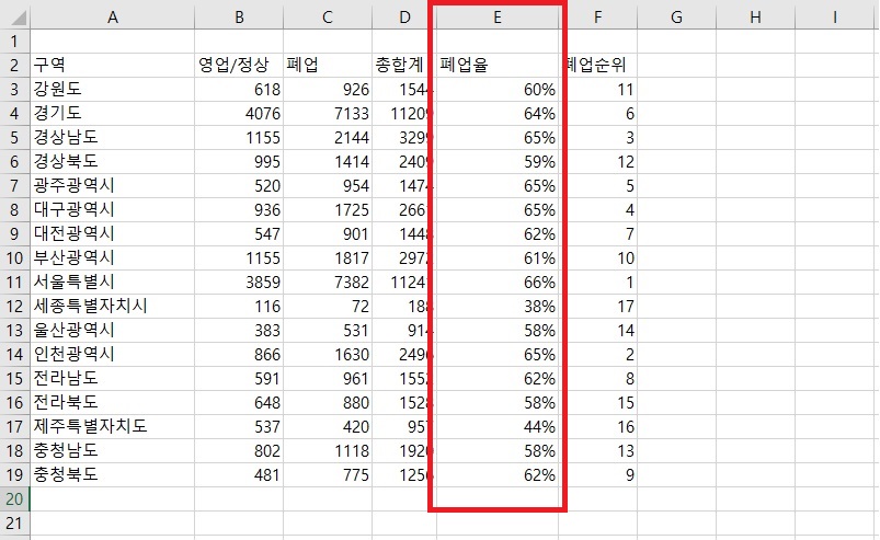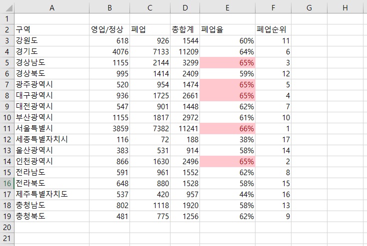 예 2) 폐업률 높은 지역 5개 지역은 어디인지?