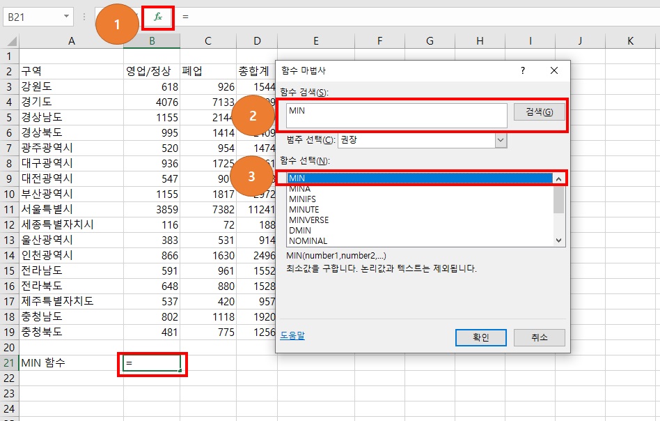 1. MIN 함수(최소값)를 함수 마법사를 통해서 최소값을 넣어보겠습니다.