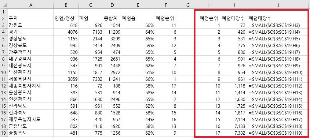 - H열은 SMALL함수에 들어가는 N번째를 입력한 것입니다.