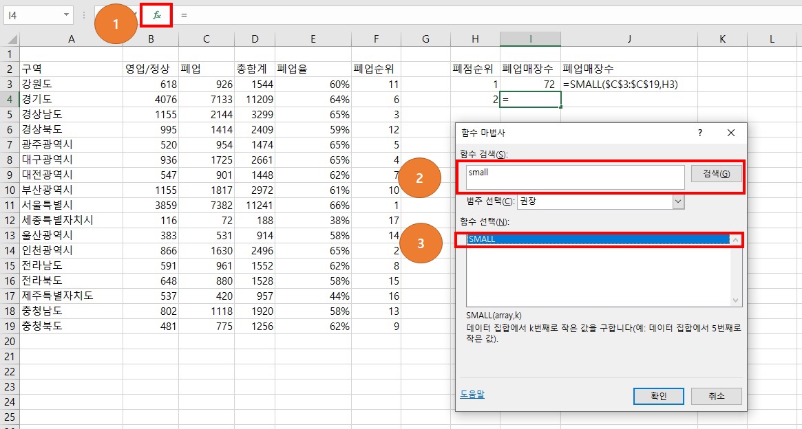 1. 함수 마법사를 통해서 SMALL 함수를 불러냅니다.