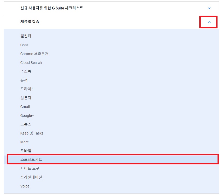4. 제품별 학습에서 보면 스프레드시트를 클릭해주세요.