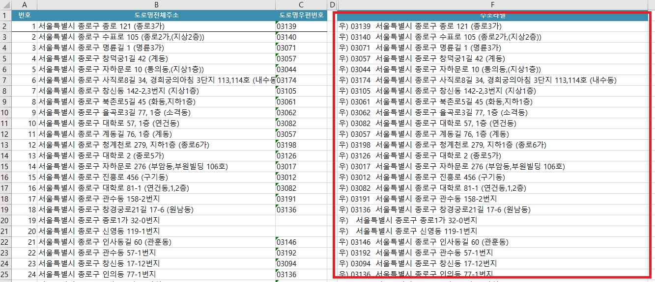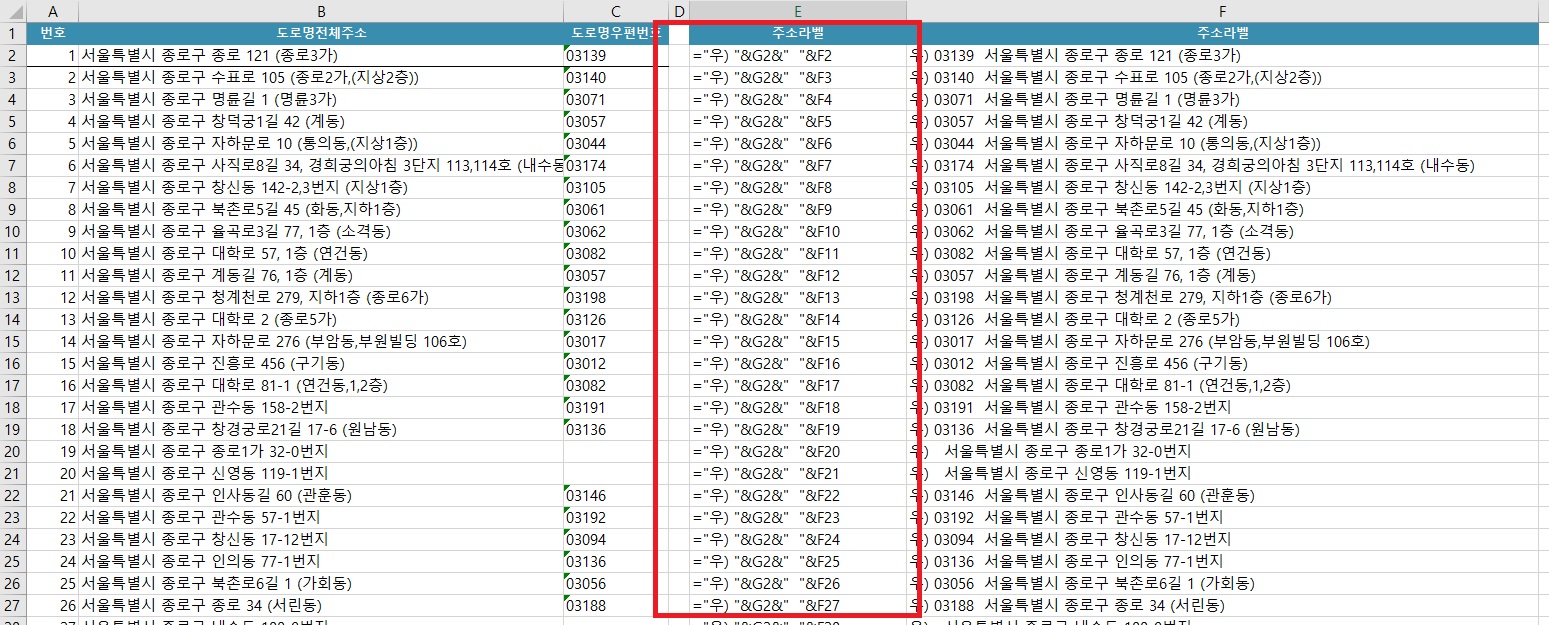 1. 우편번호와 주소를 & 기호를 활용하여 합치기를 진행합니다.