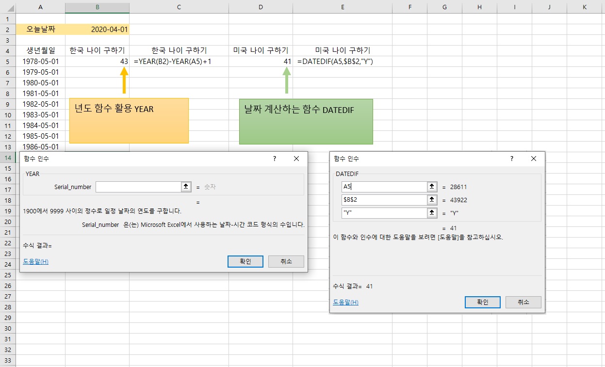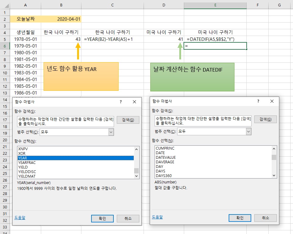 엑셀 나이 구하는 방법(YEAR함수, DATEDIF 함수)
