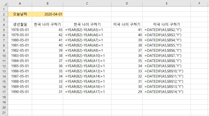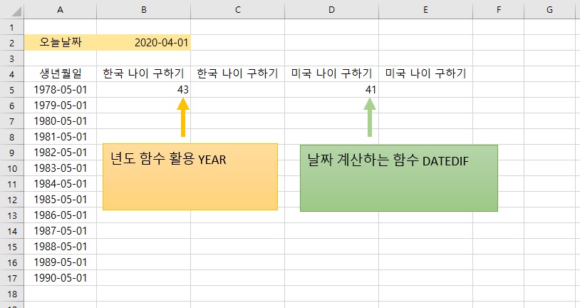 1. 한국나이 구하기는 YEAR 함수를 활용 / 미국 나이 DATEDIF 함수 활용