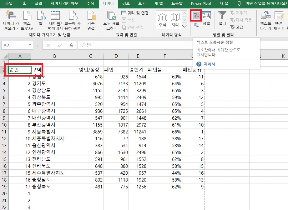 A2 순번에 커서를 두고 내림차순 단축키를 클릭합니다.