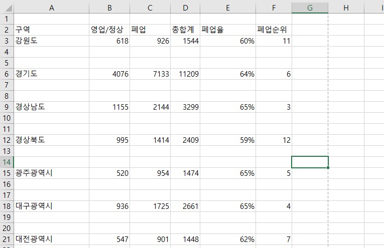 아래 시트를 예제로 해서 모든행에 2칸씩 삽입해보겠습니다.