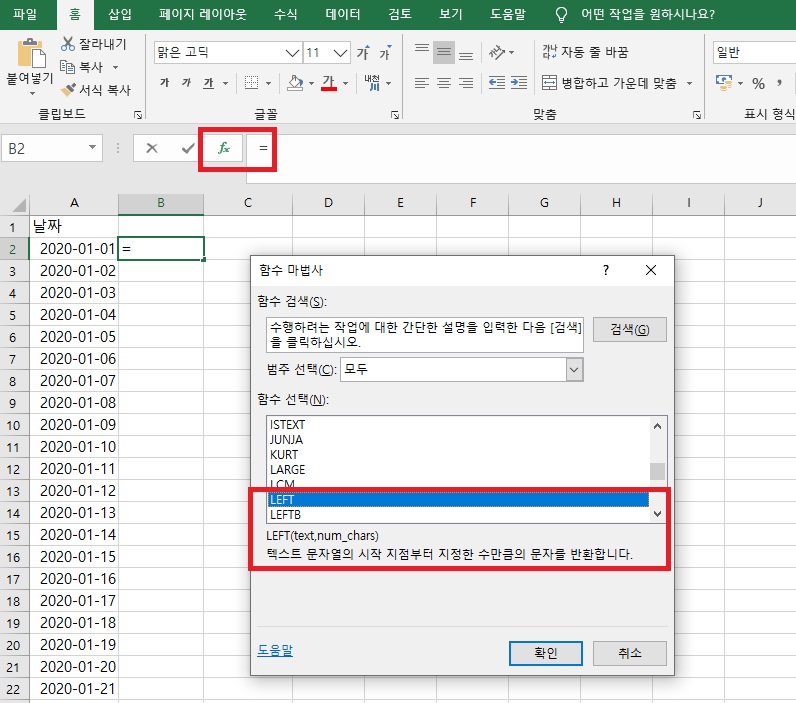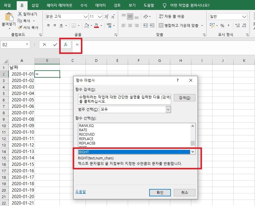 2. 함수마법사를 통해서 RIGHT함수와 LEFT함수를 불러옵니다.