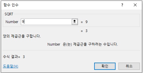 3. 엑셀 SQRT함수 값에 인수를 입력 또는 셀을 입력