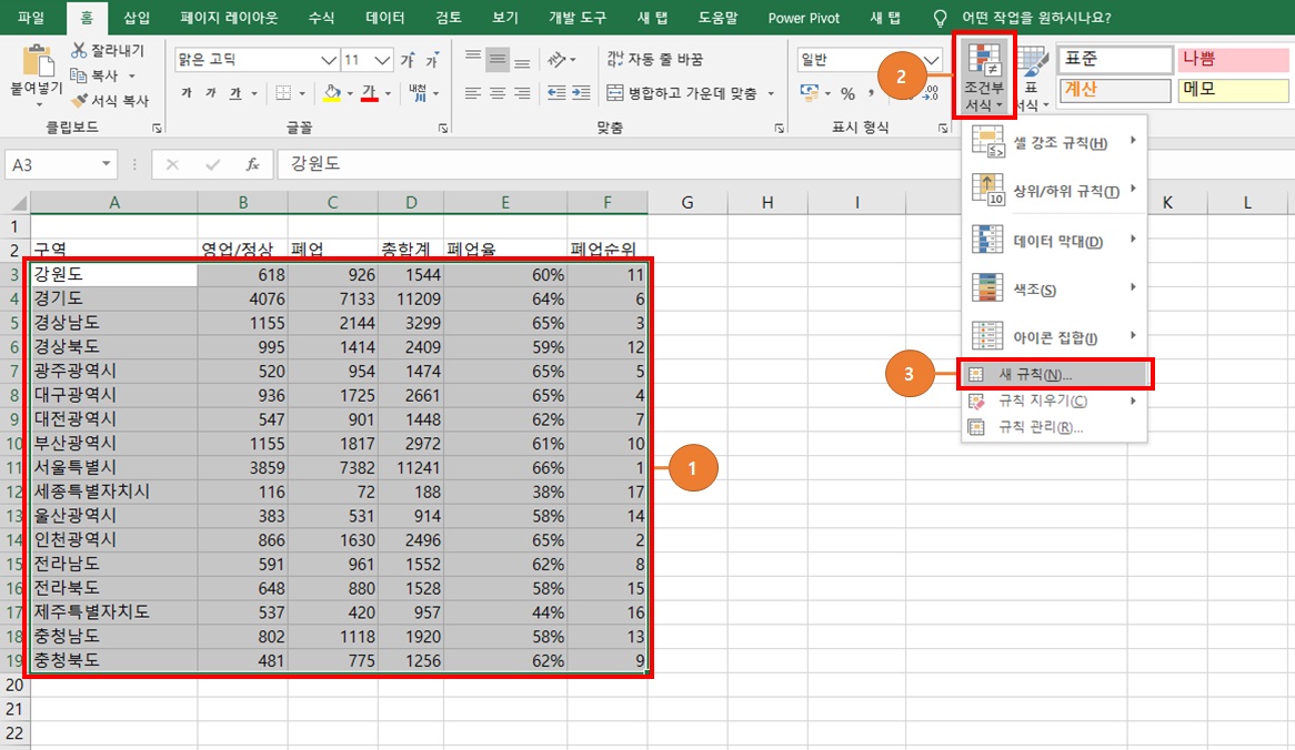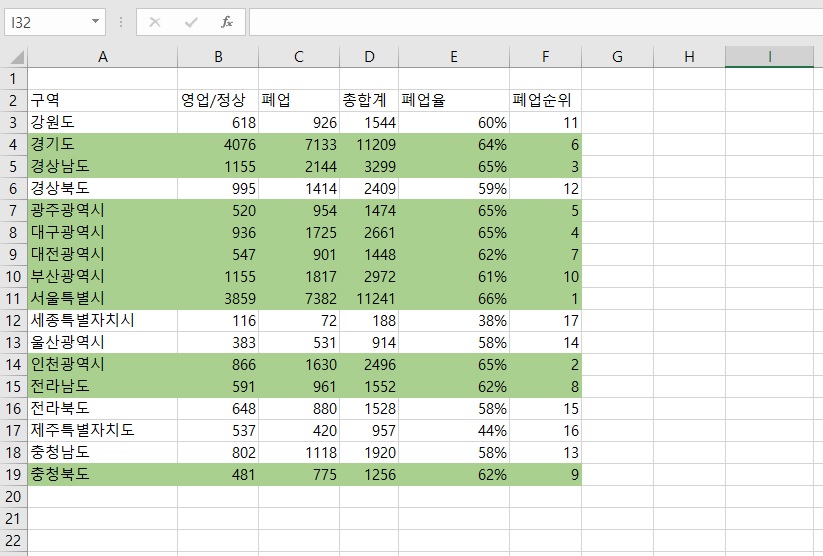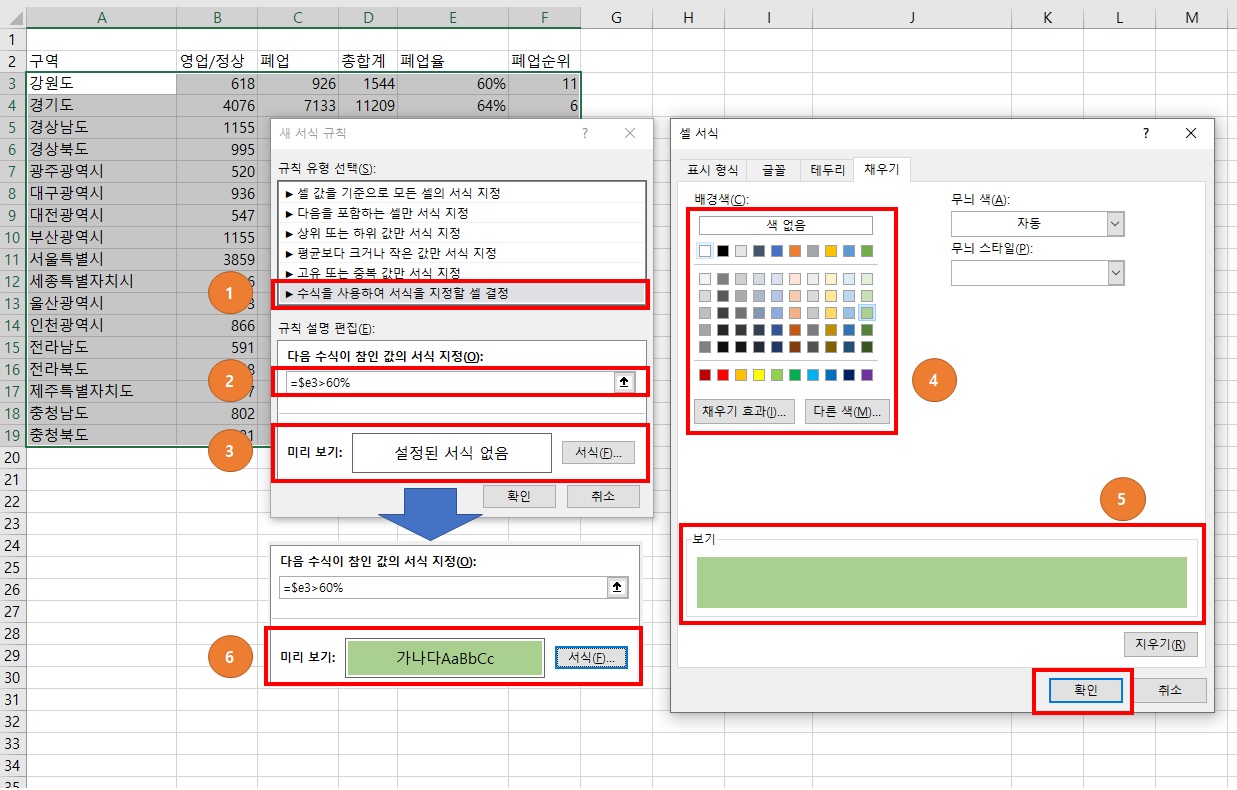 상황 : 엑셀 데이터중 폐업률이 60%초과인 지역에 대해서 색깔로 구별해보자