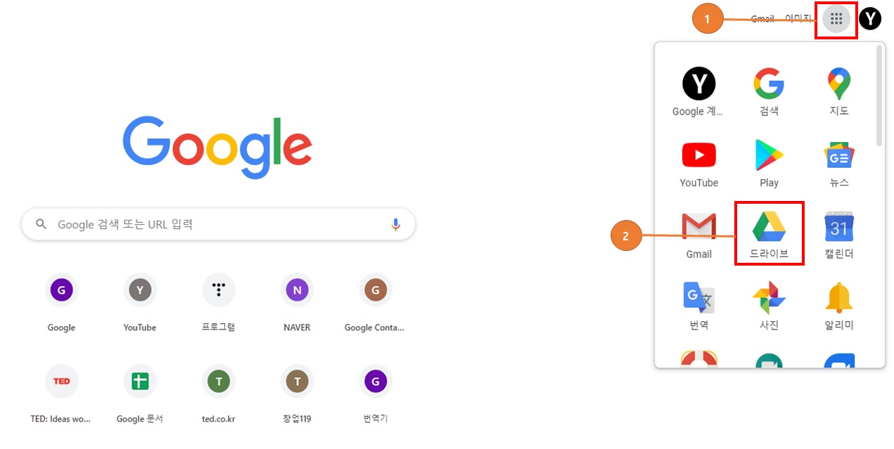1번 : 크롬사이트에서 구글 홈페이지들어가면 오른쪽 상단 점 9개 그림이 나오는데 클릭