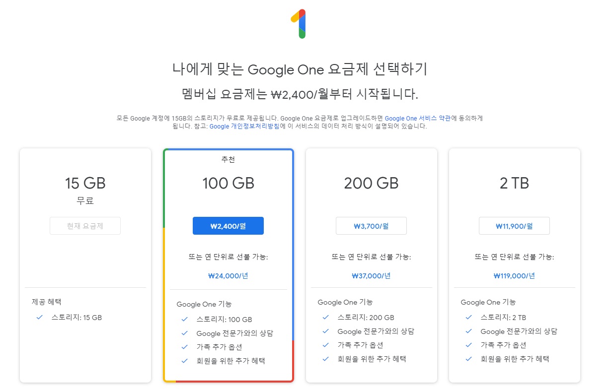 구글 용량에 따라 무료에서 유료로 변환되며, 유료로 변환시 구글에서 별도 서비스 제공이 이루어짐