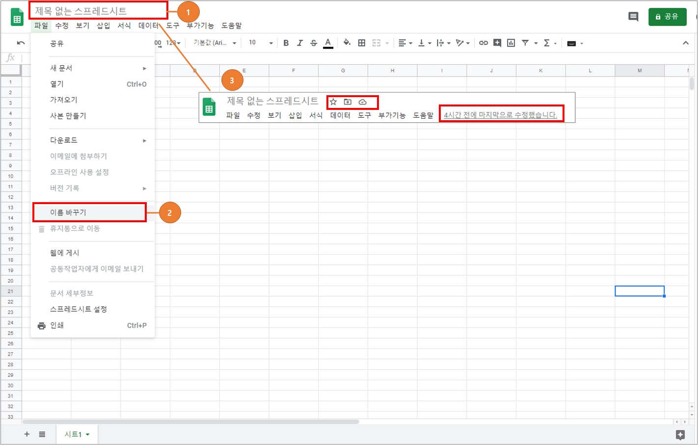 1번 : "제목 없는 스프레드시트"에 마우스로 클릭하면 제목을 입력할수 있게 변경되고 입력하면됩니다.