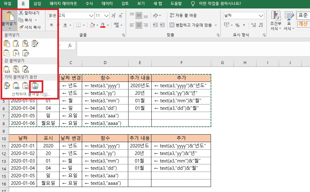 2) 기타 붙여넣기 옵션에 어떻형태로 붙여 넣을지 선택