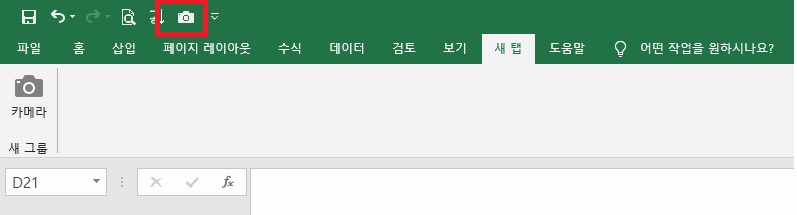 엑셀에서 캡쳐기능을 보통 카메라를 통해서 캡쳐를 사용하는데 카메라 기능이 숨어져있습니다.
