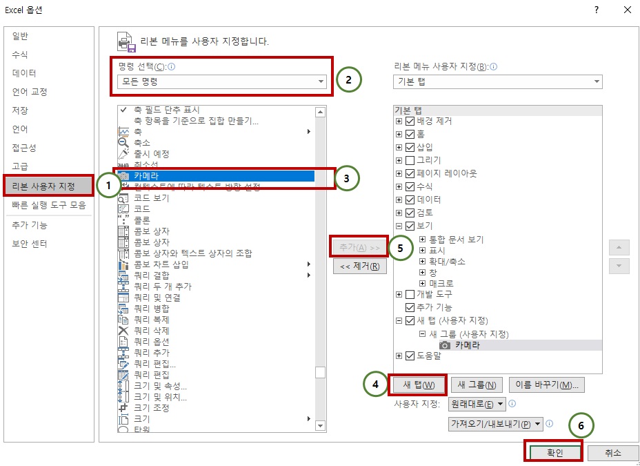 옵션경로로 들어올경우 리본 사용자 지정으로 이동됩니다.