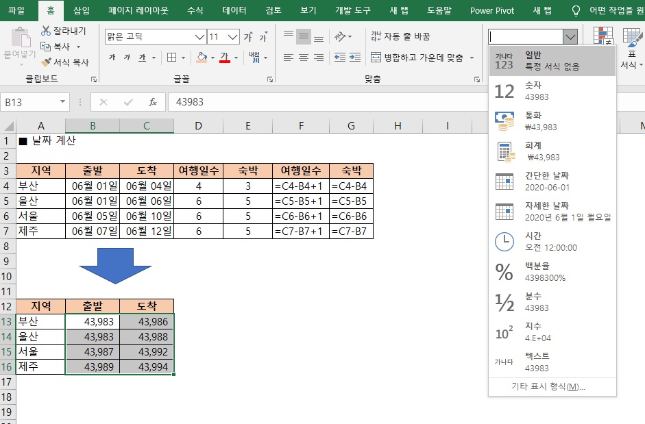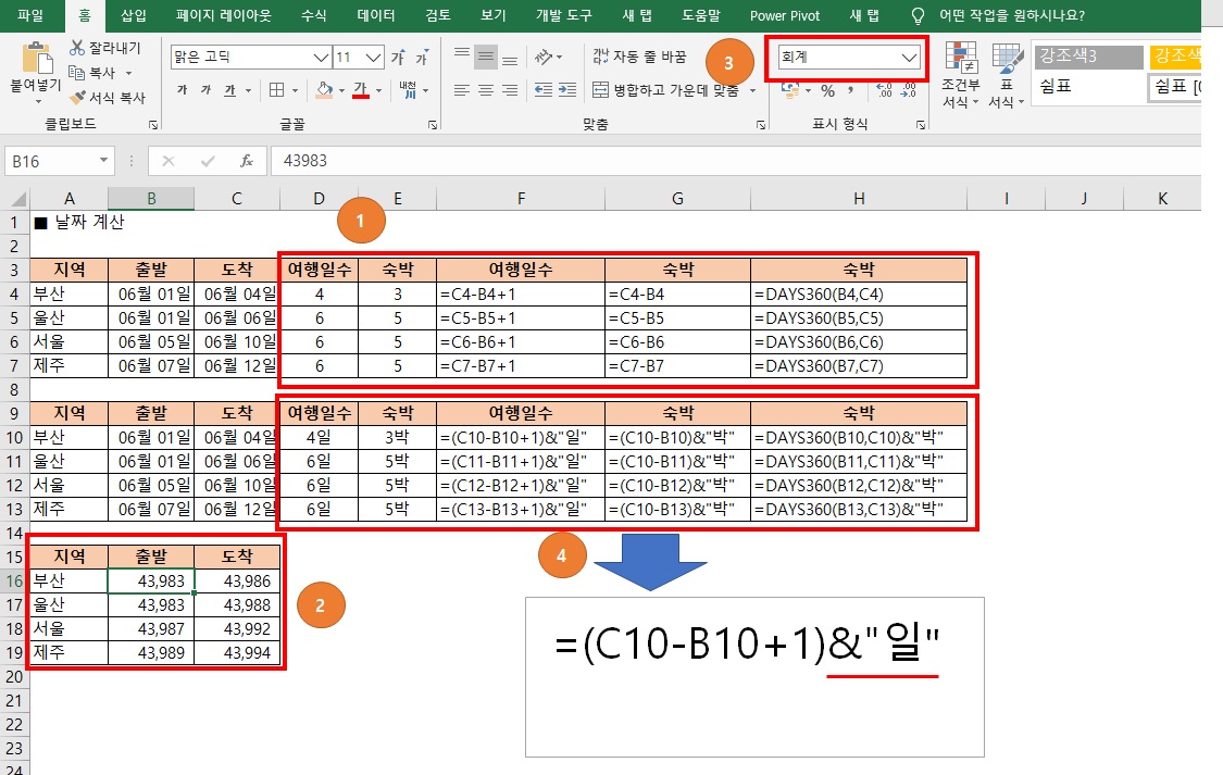 2번 : 출발날짜와 도착 날짜를 3번에 회계로 변경하면 숫자로 변경됨