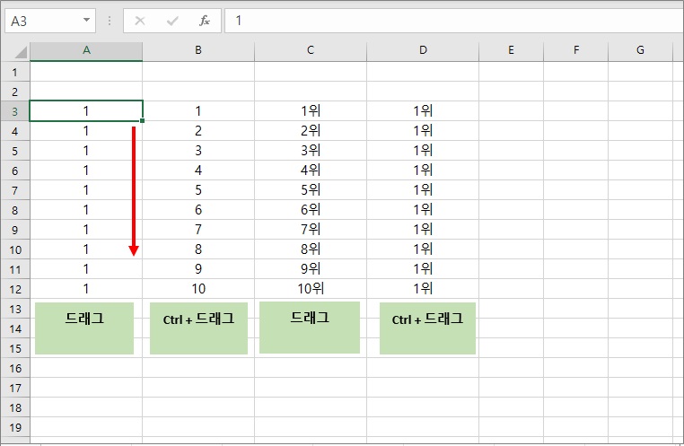 2번 : "Ctrl + 드래그" 순차적으로 늘어나면서 채워집니다.